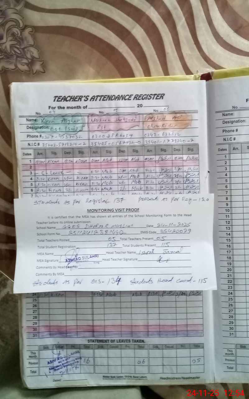 | Attendance Register | Head Teacher | MEA with School | Visit Proof |