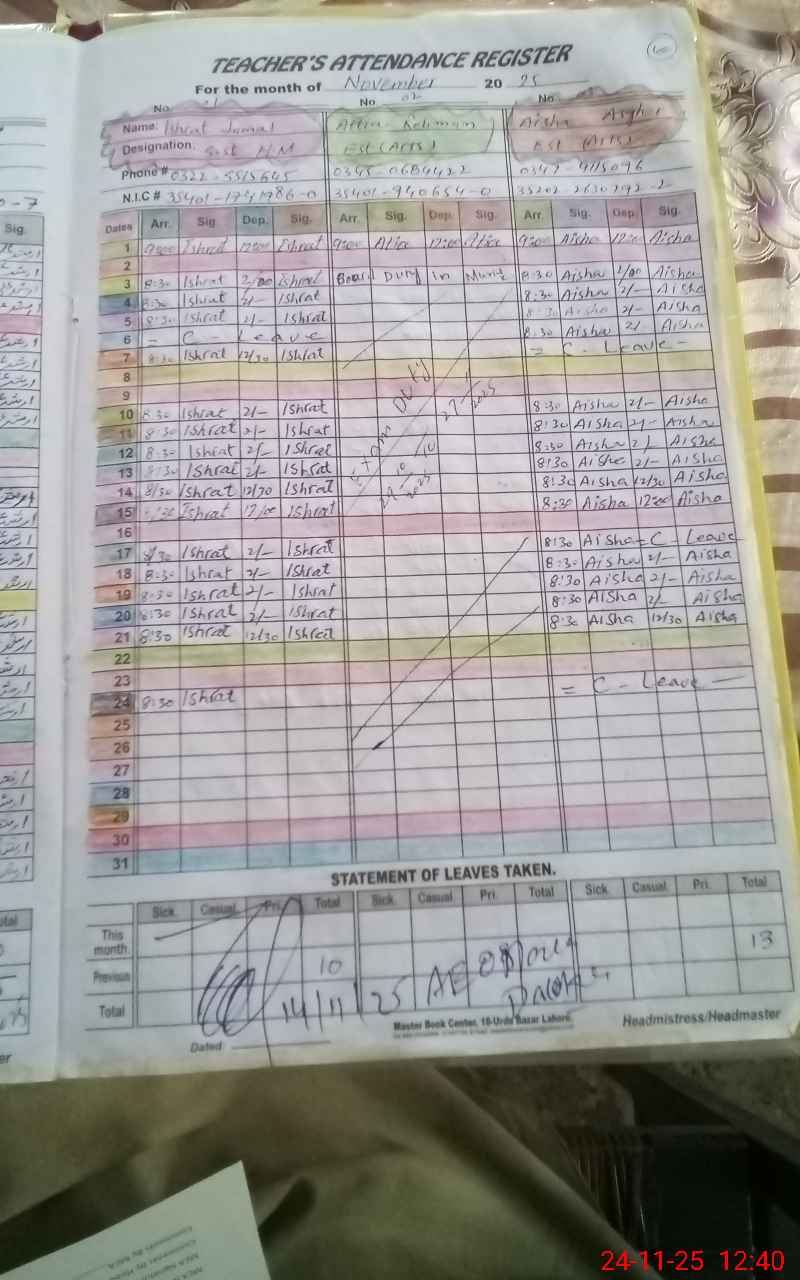 | CNIC | Full Name | Designation | R/C | Absence During Last Calender Month |