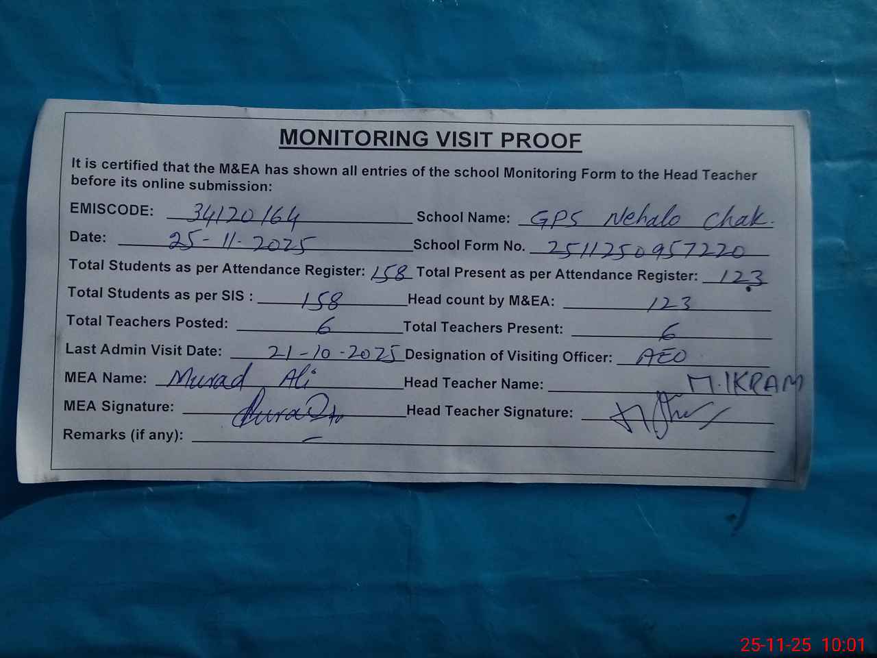 | Attendance Register | Head Teacher | MEA with School | Visit Proof |
