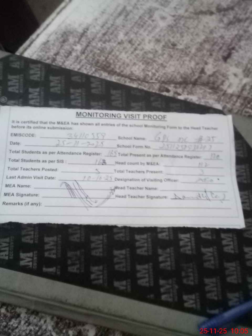 | Attendance Register | Head Teacher | MEA with School | Visit Proof |