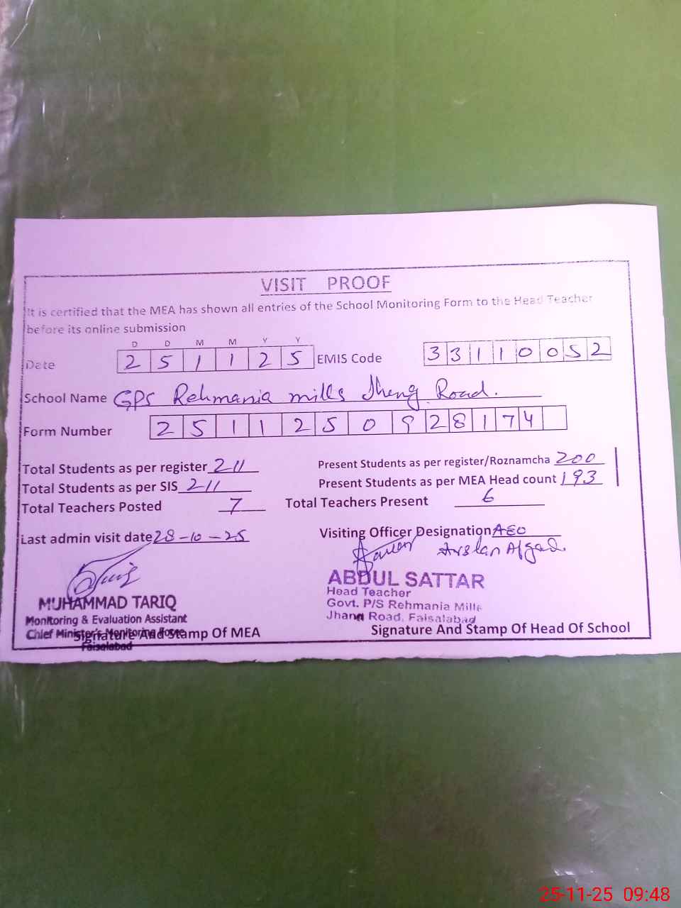 | Attendance Register | Head Teacher | MEA with School | Visit Proof |
