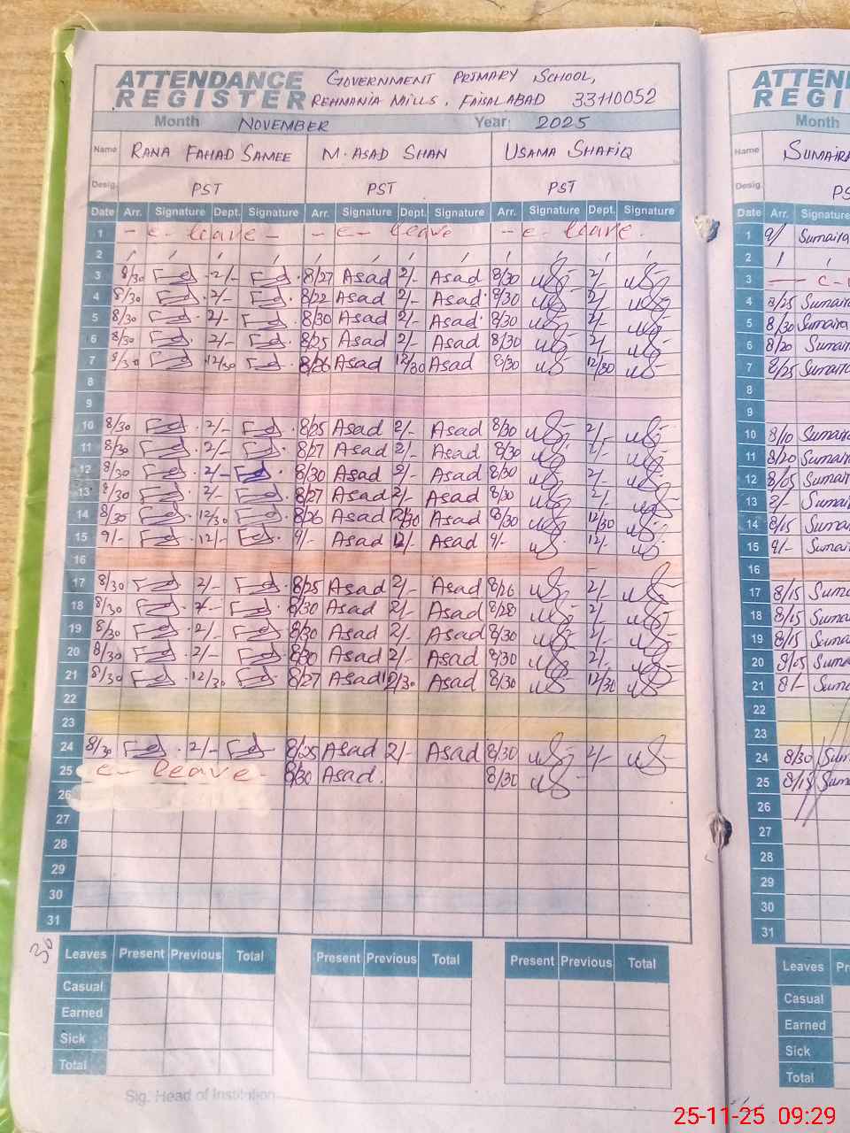 | CNIC | Full Name | Designation | R/C | Absence During Last Calender Month |