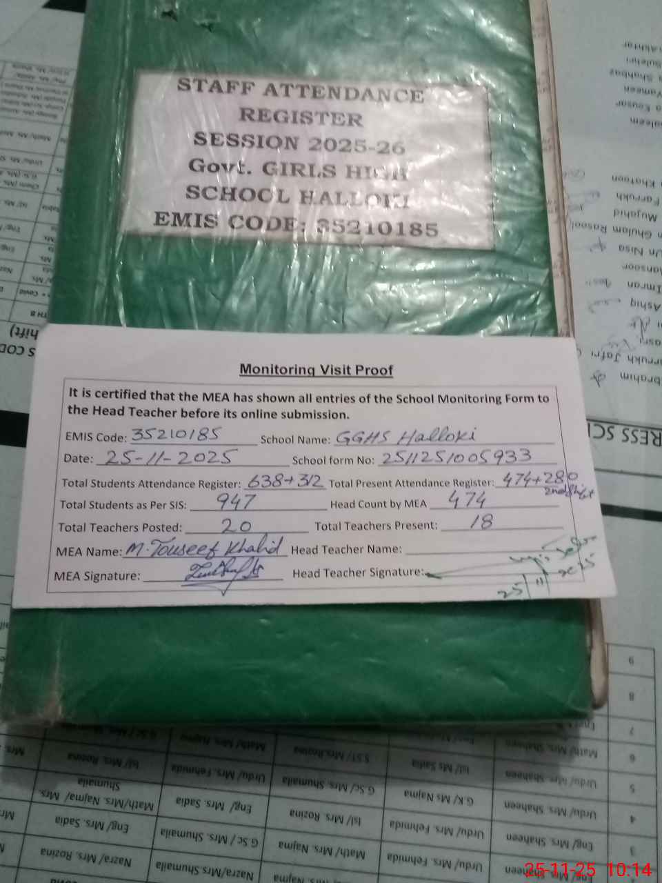 | Remarks (Use Separate Page if Required): Total sanctioned seats Teachers 20 and filled seats 20 AEO visit date 28 October 2025 | |||||