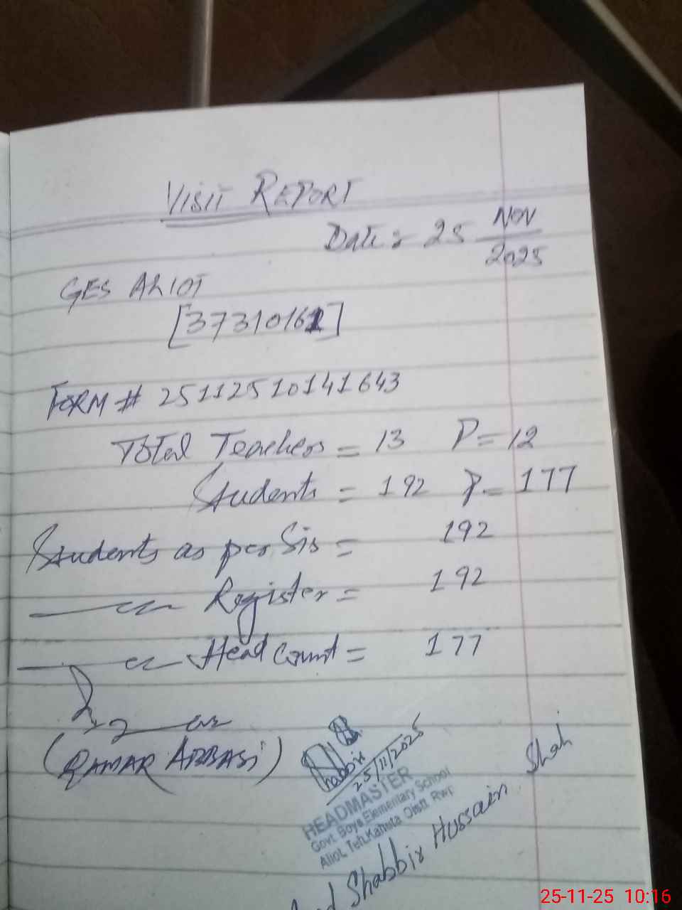 | Attendance Register | Head Teacher | MEA with School | Visit Proof |