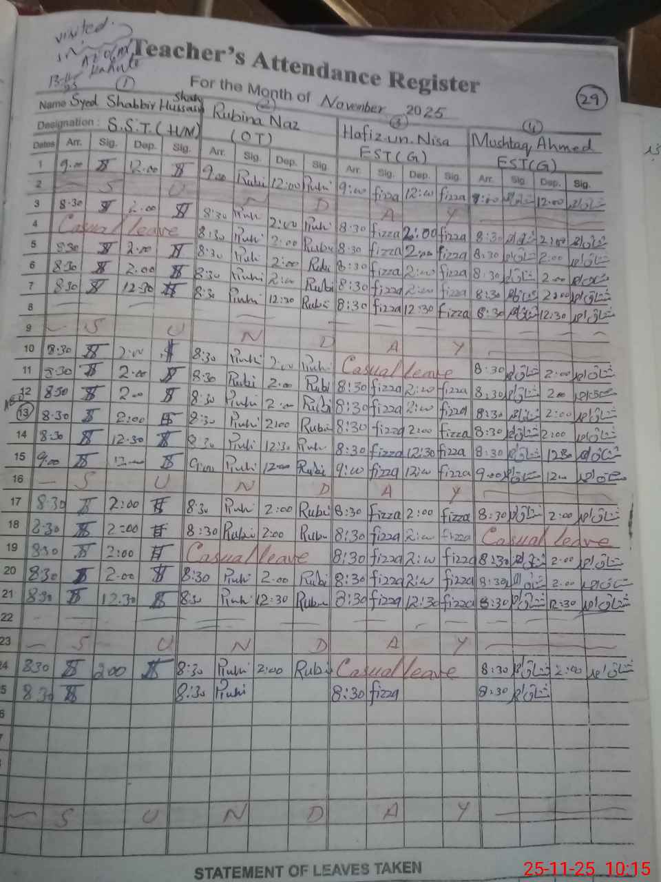 | CNIC | Full Name | Designation | R/C | Absence During Last Calender Month |