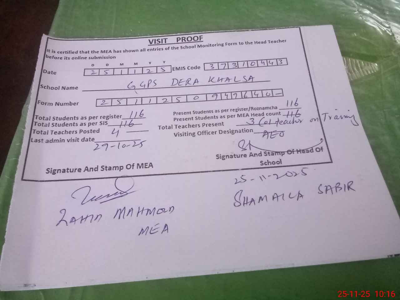 | Monitoring Date: 25-11-2025 | Start Time: 25-11-2025 09:45 AM | End Time: 25-11-2025 10:18 AM | Name of MEA: Za**** Me**** | |
