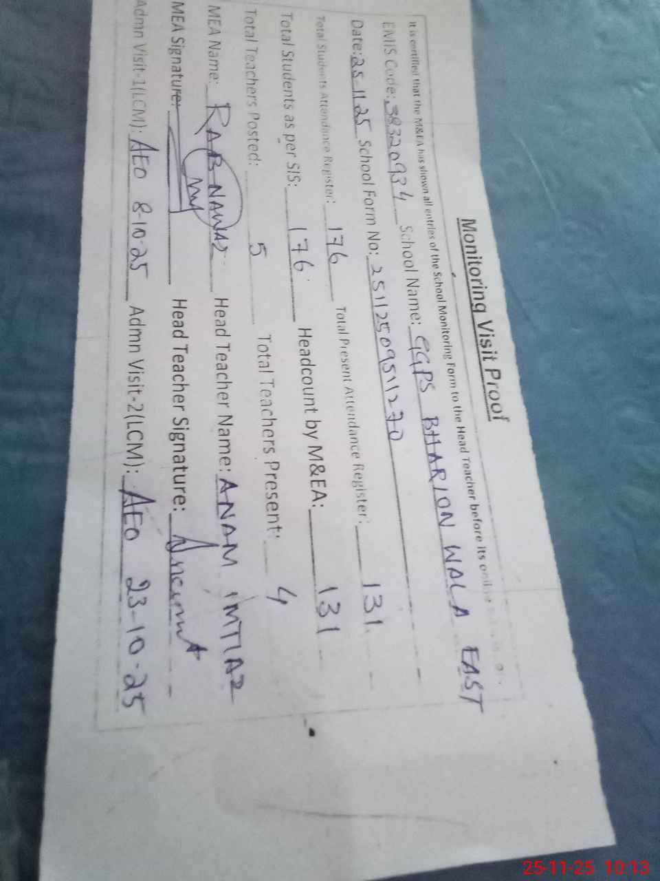 | Attendance Register | Head Teacher | MEA with School | Visit Proof |