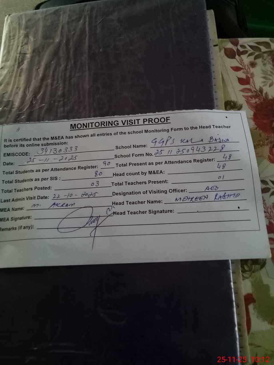 | Attendance Register | Head Teacher | MEA with School | Visit Proof |