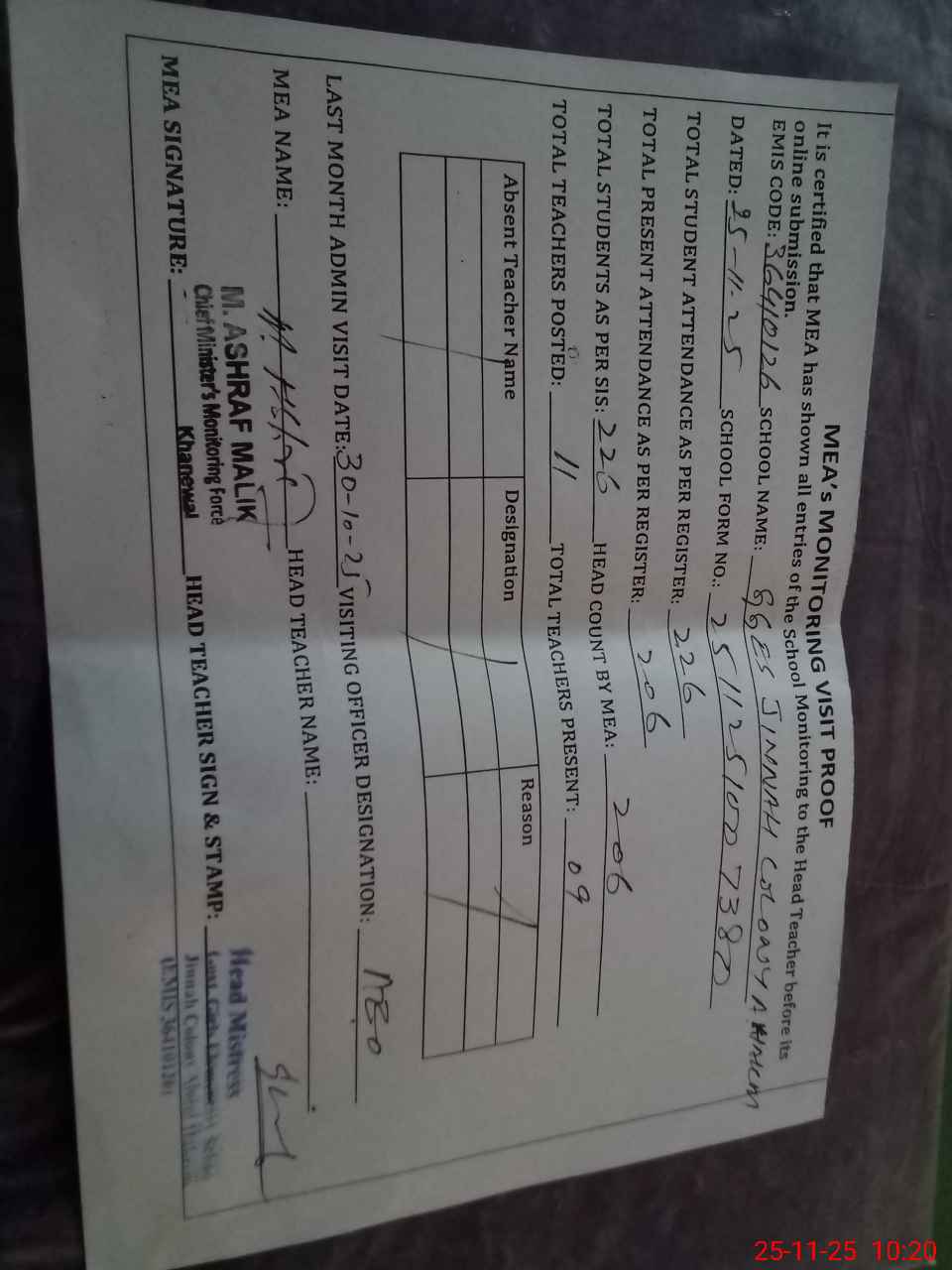 | Attendance Register | Head Teacher | MEA with School | Visit Proof |