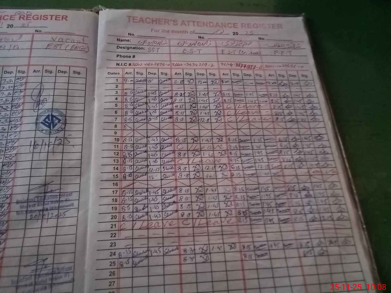 | CNIC | Full Name | Designation | R/C | Absence During Last Calender Month |