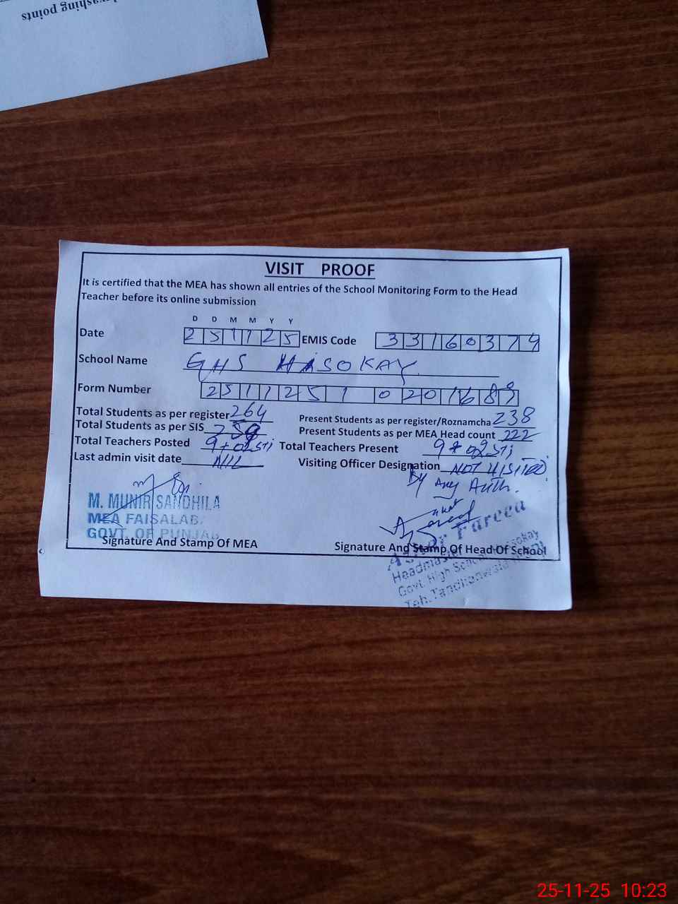 | Attendance Register | Head Teacher | MEA with School | Visit Proof |