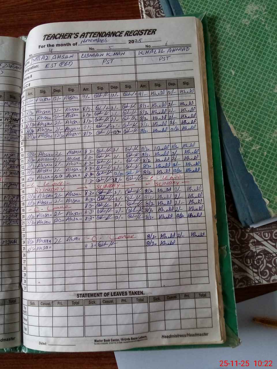| Leave | Duty | Absent | Maternity | Medical | Ex- Pak |