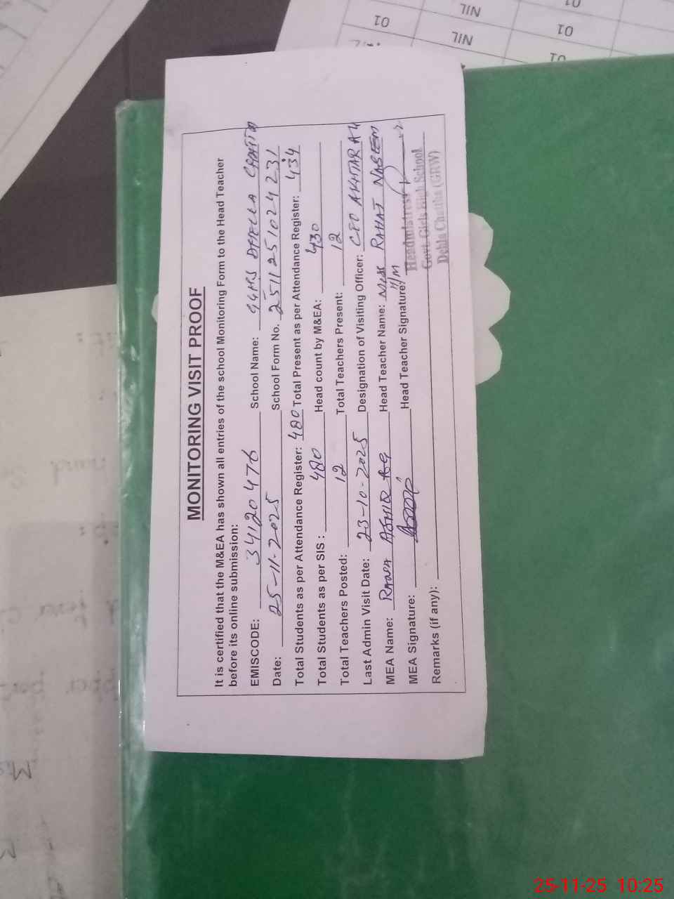 | Attendance Register | Head Teacher | MEA with School | Visit Proof |