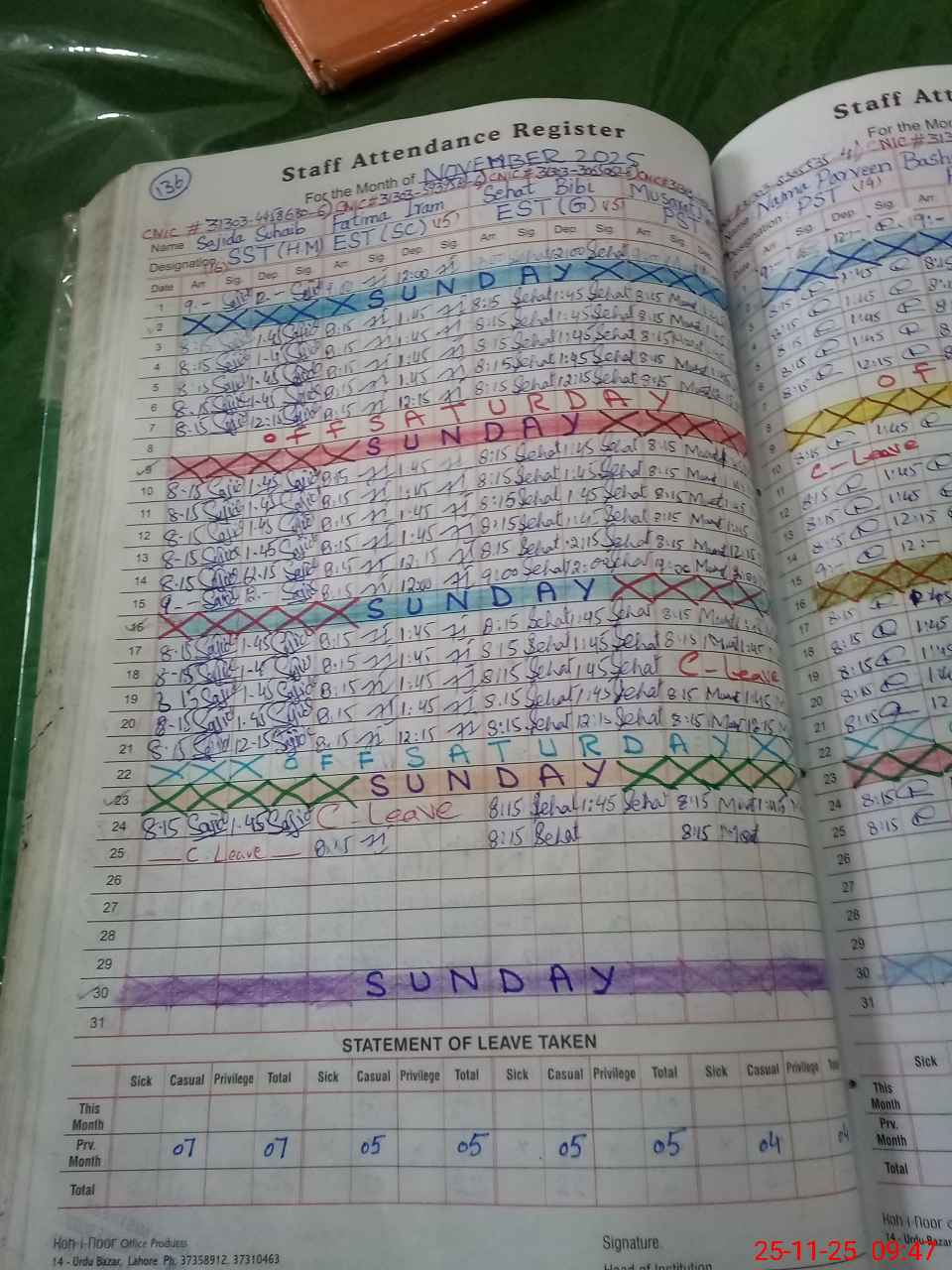 | CNIC | Full Name | Designation | R/C | Absence During Last Calender Month |