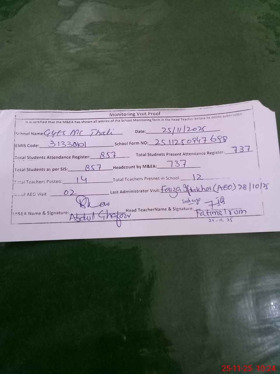 | Attendance Register | Head Teacher | MEA with School | Visit Proof |