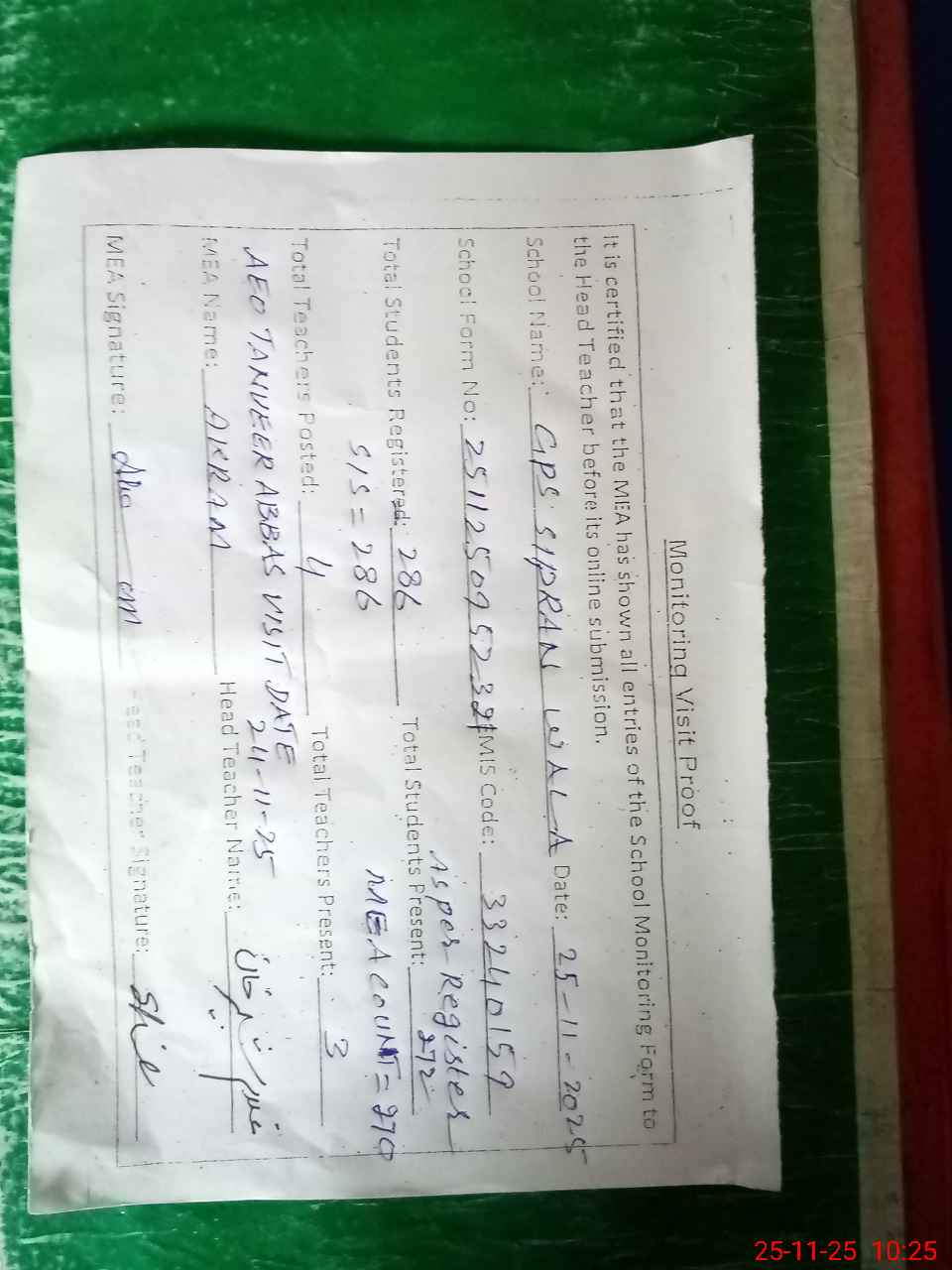| EMIS Code: 33240159 | Name of School: GPS SIPRAN WALA | |||