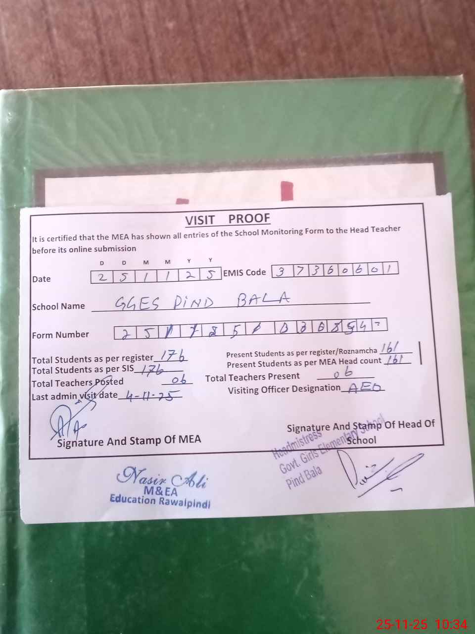 | Attendance Register | Head Teacher | MEA with School | Visit Proof |