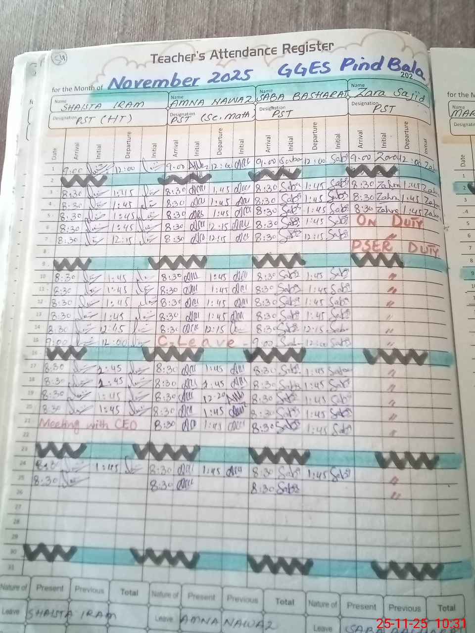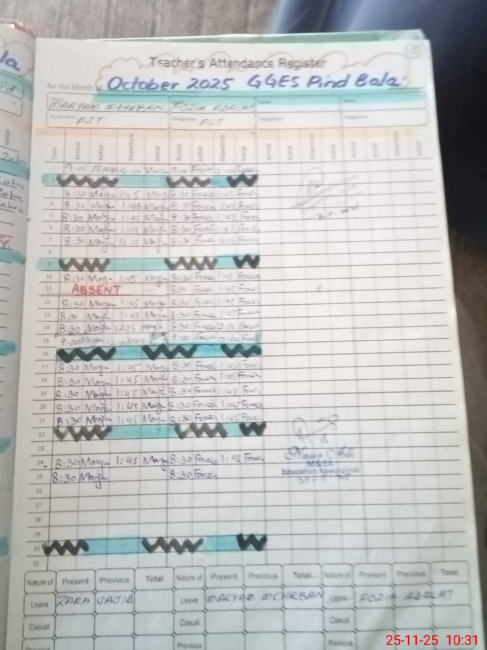 | Leave | Duty | Absent | Maternity | Medical | Ex- Pak |