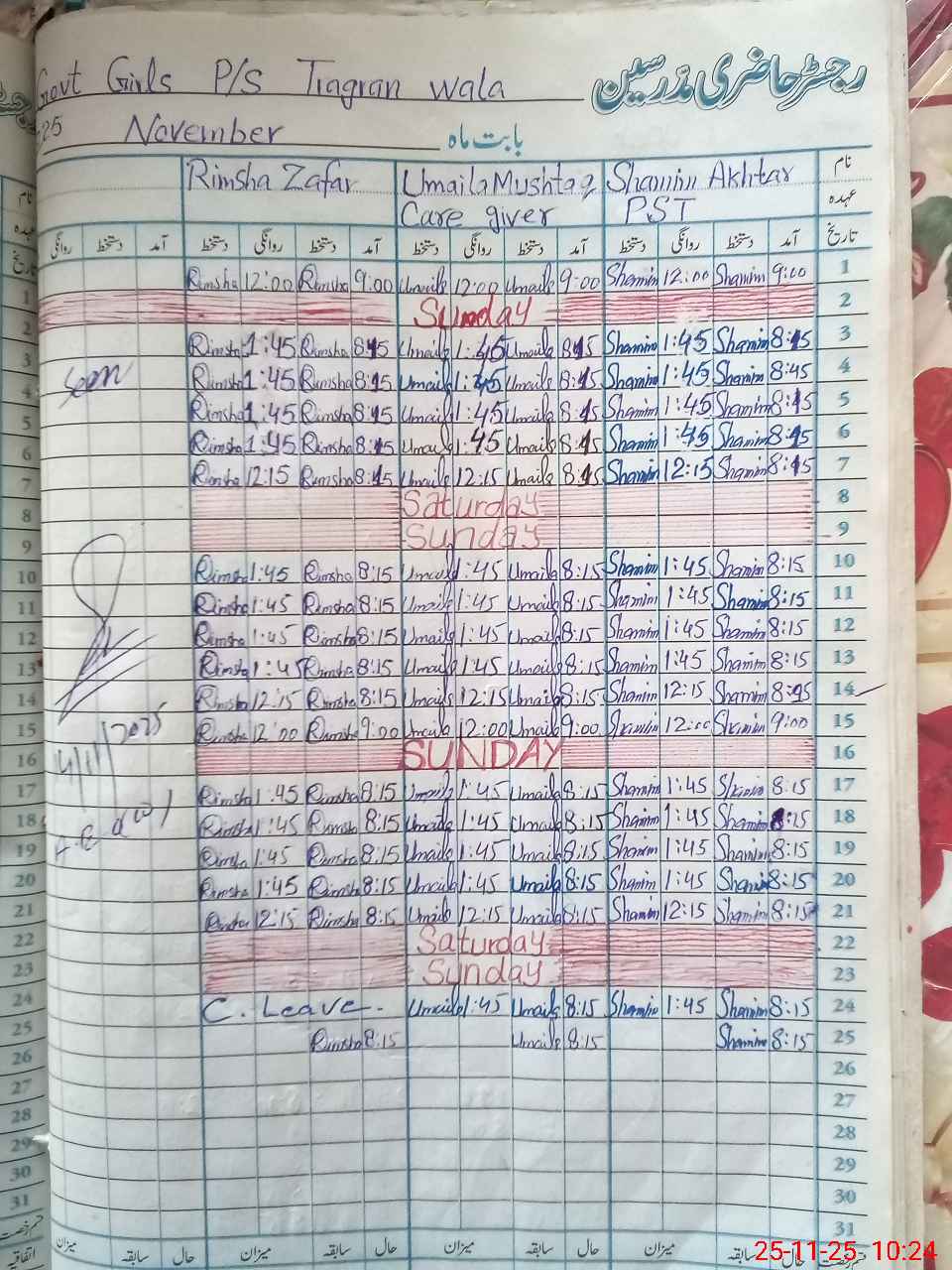 | CNIC | Full Name | Designation | R/C | Absence During Last Calender Month |