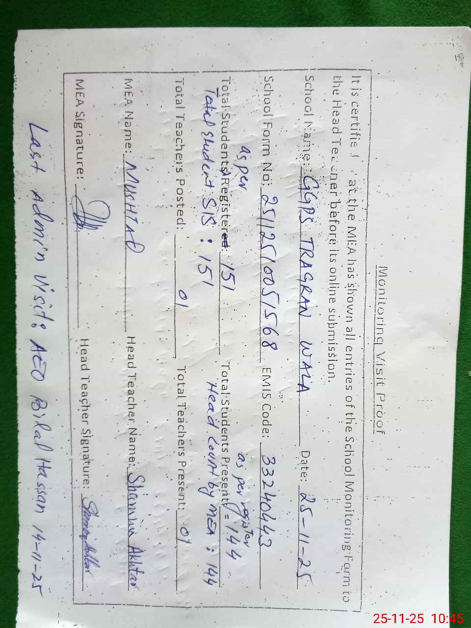 | Attendance Register | Head Teacher | MEA with School | Visit Proof |