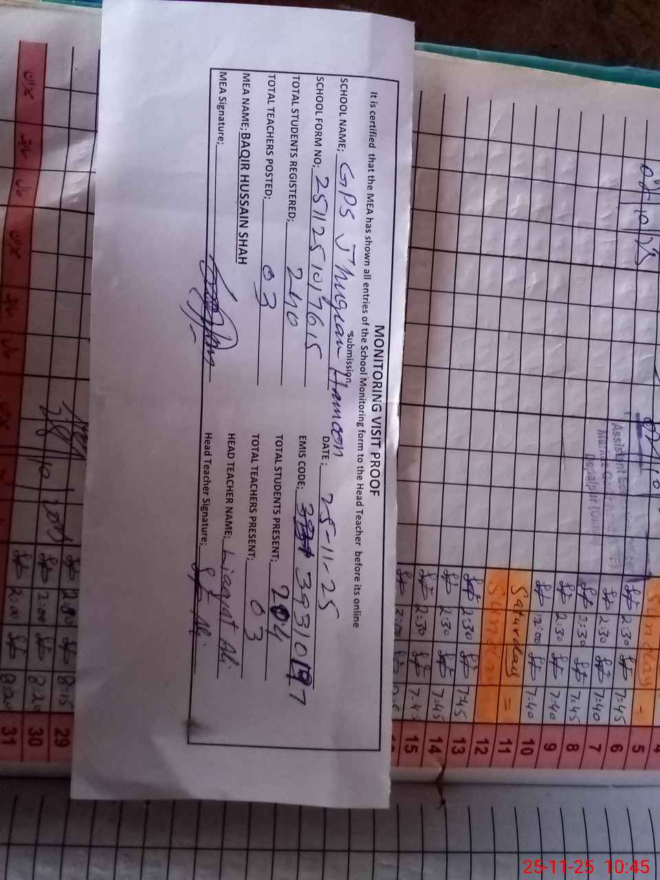 | Attendance Register | Head Teacher | MEA with School | Visit Proof |