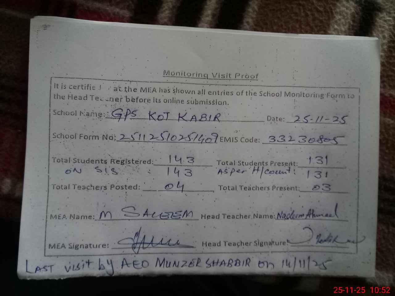 | Attendance Register | Head Teacher | MEA with School | Visit Proof |