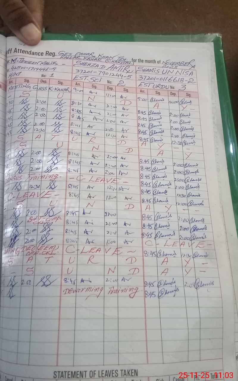 | CNIC | Full Name | Designation | R/C | Absence During Last Calender Month |