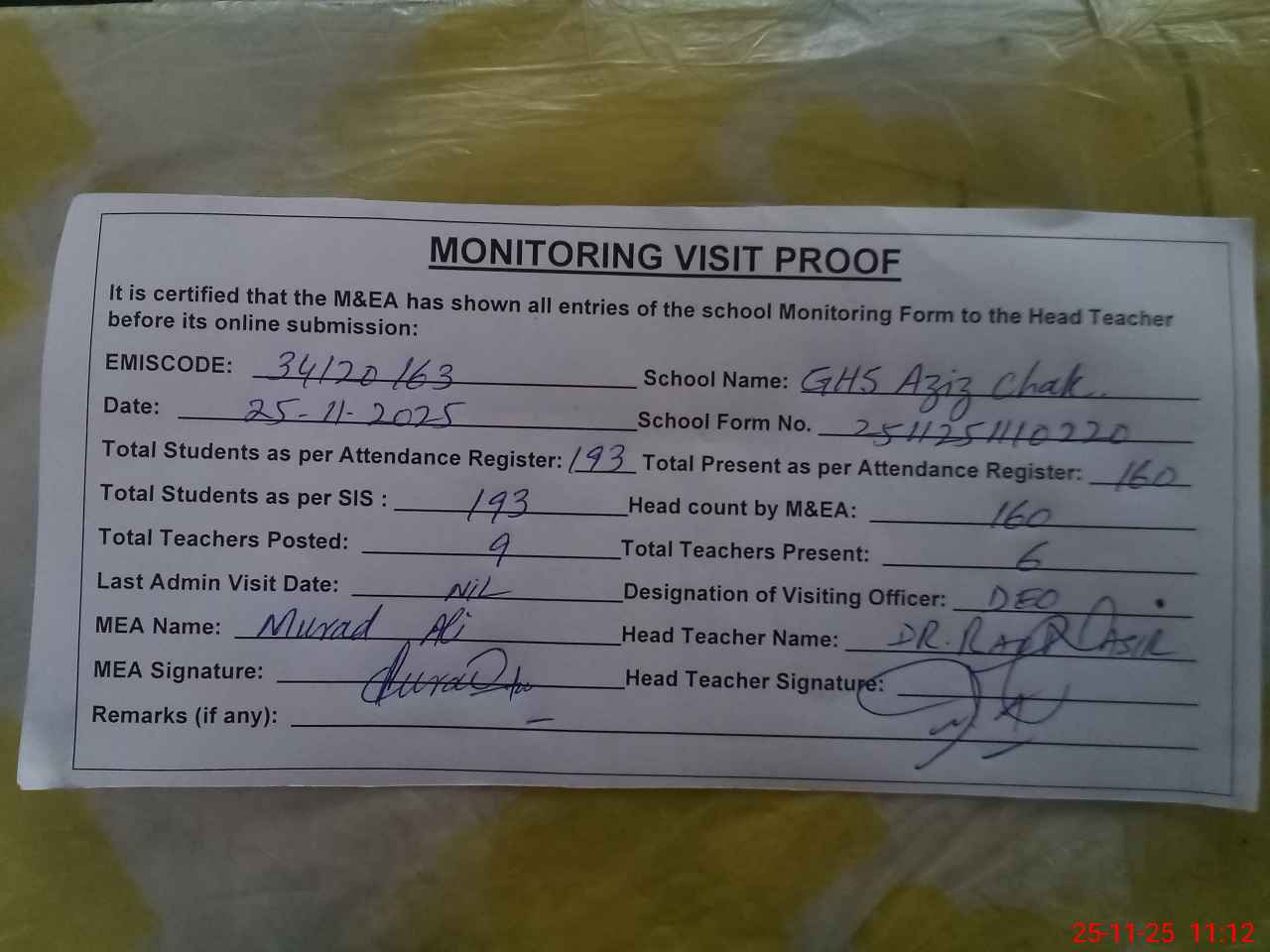 | EMIS Code: 34120163 | Name of School: GHS AZIZ CHAK | |||