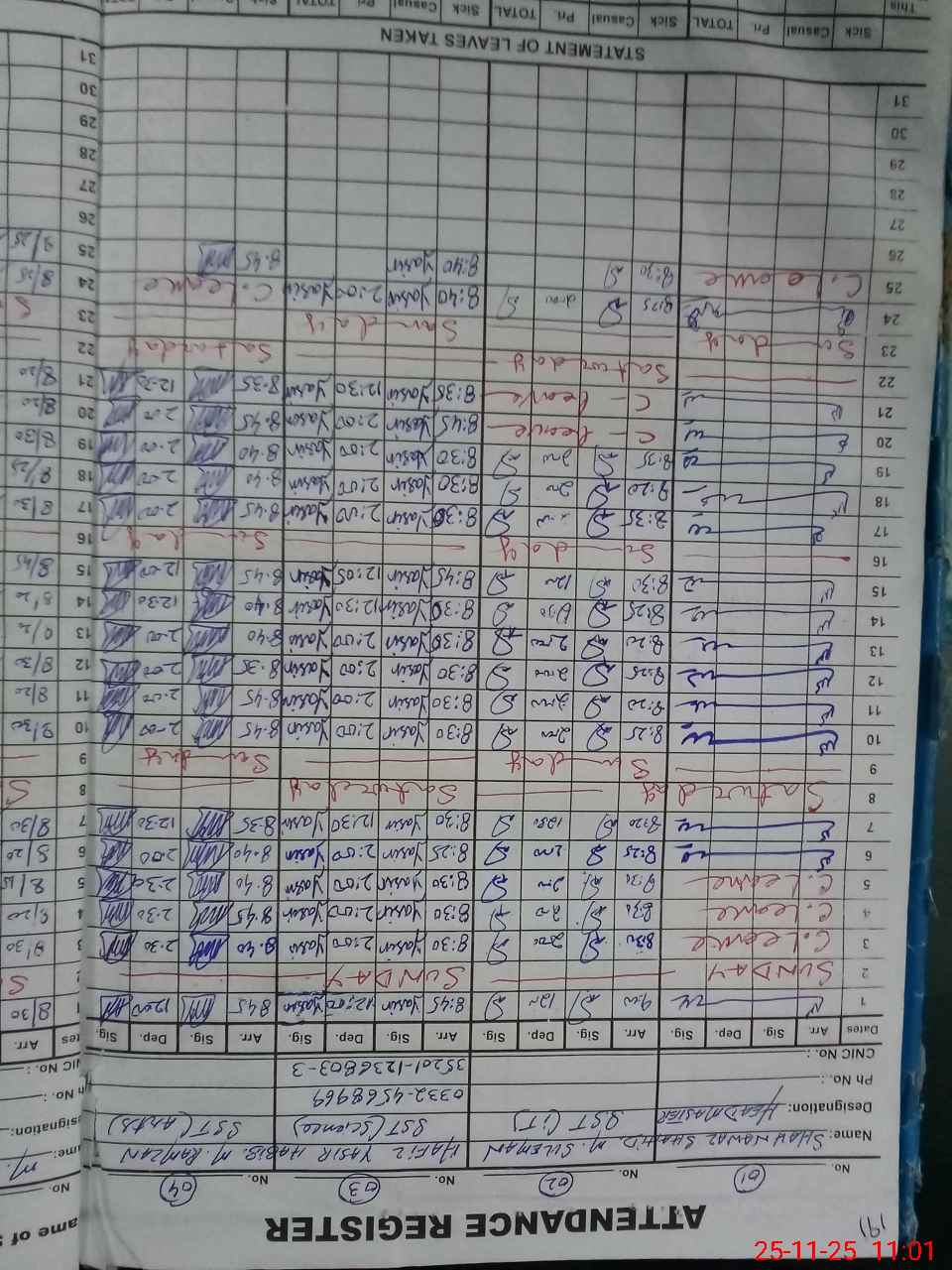 | CNIC | Full Name | Designation | R/C | Absence during last cal. month |