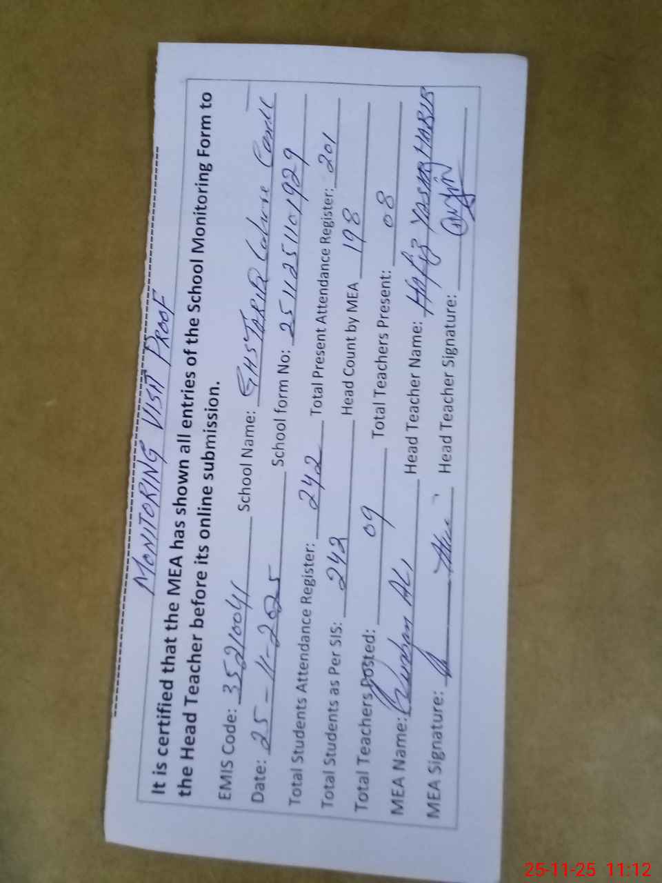 | Attendance Register | Head Teacher | MEA with School | Visit Proof |