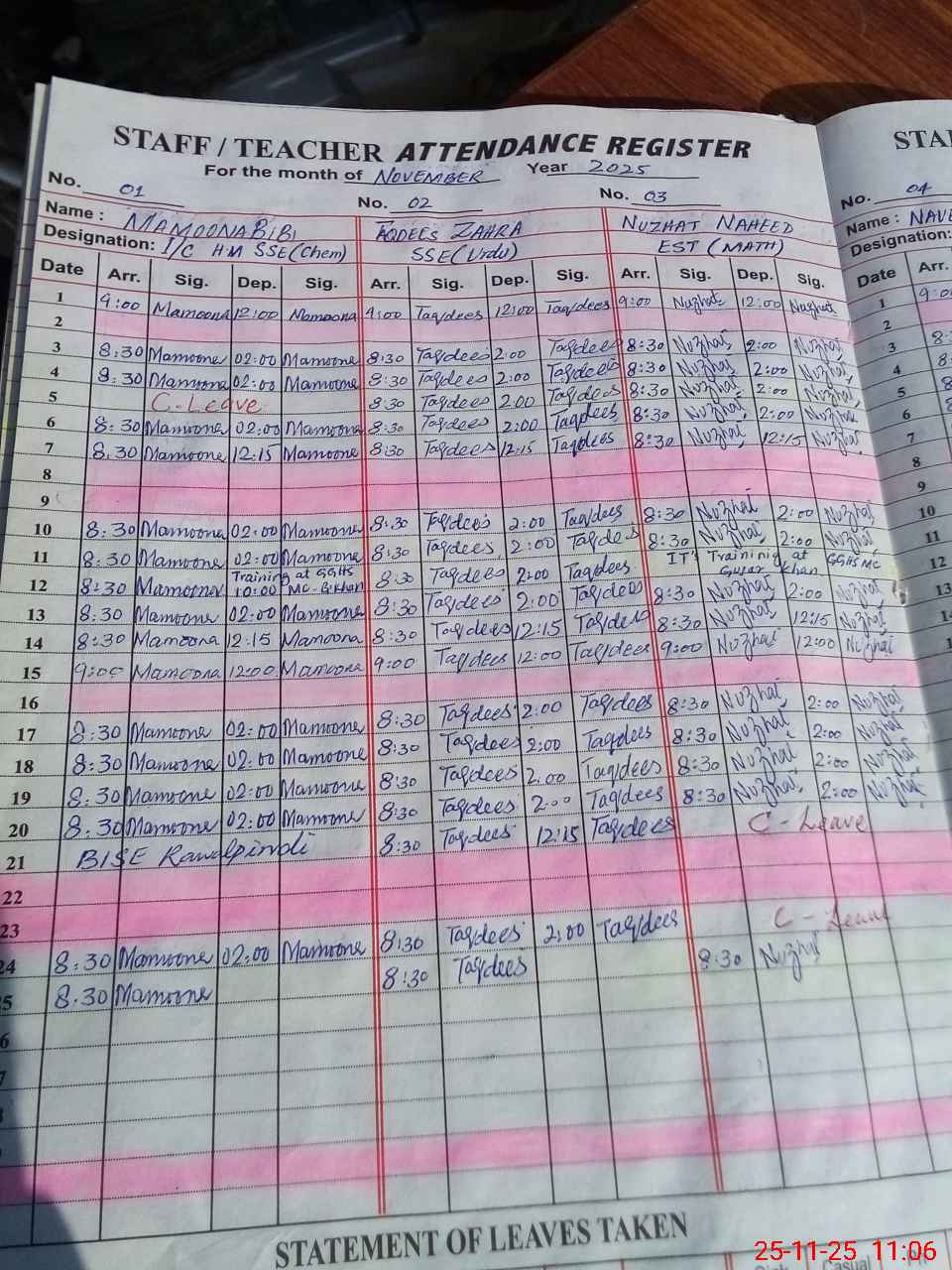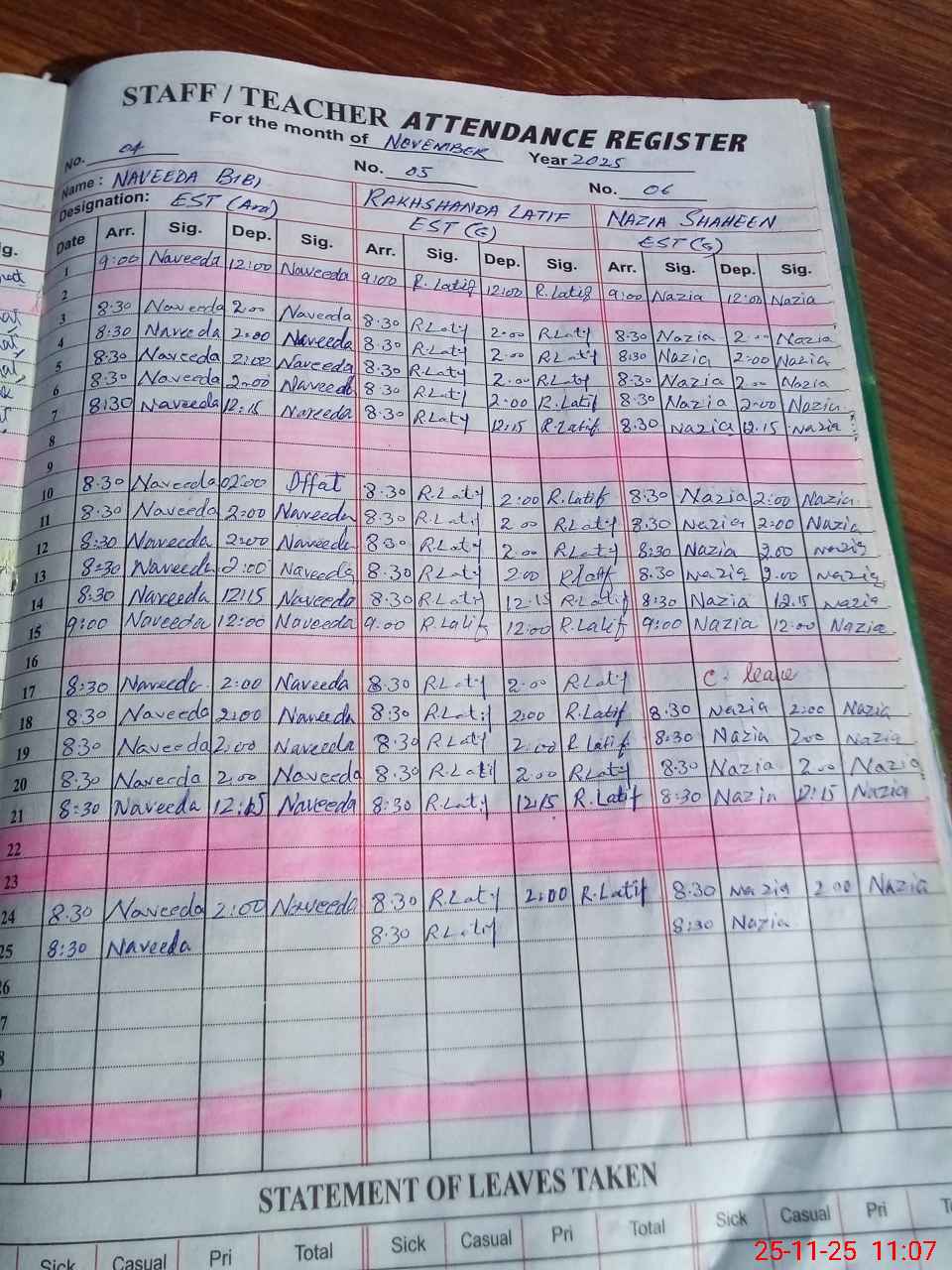 | CNIC | Full Name | Designation | R/C | Absence During Last Calender Month |