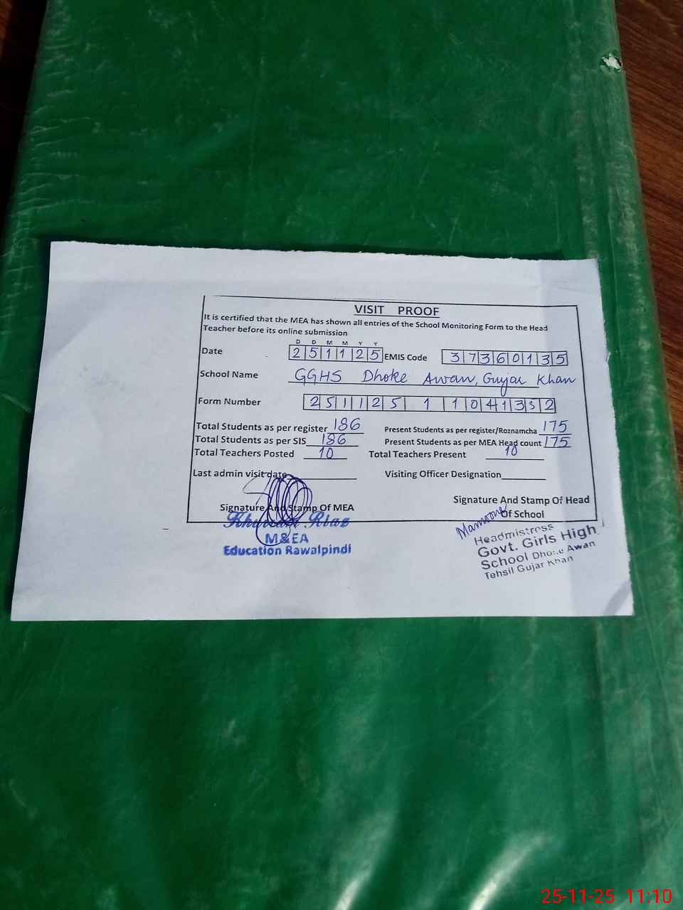 | Attendance Register | Head Teacher | MEA with School | Visit Proof |
