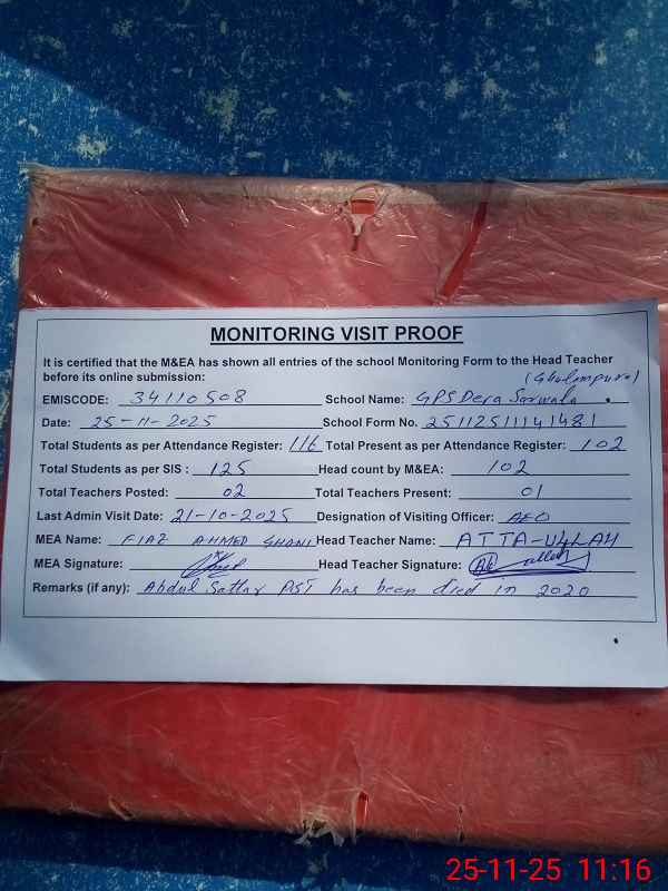 | EMIS Code: 34110508 | Name of School: GPS DERA SARWALA (GHULAM PURA) | |||
