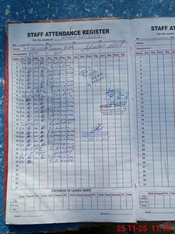 | Remarks (Use Separate Page if Required): Attendance of teaching staff and students on SIS Software is updated Abdul Sattar PST has been died in 2020 according to Head Teacher Data as per provided by School Staff and found during physical visit | |||||