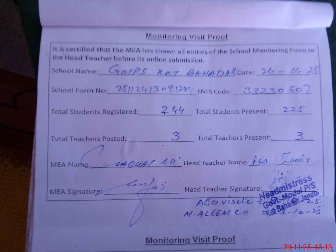 | EMIS Code: 33230607 | Name of School: GMPS KOT BAHADUR JANUBI | |||