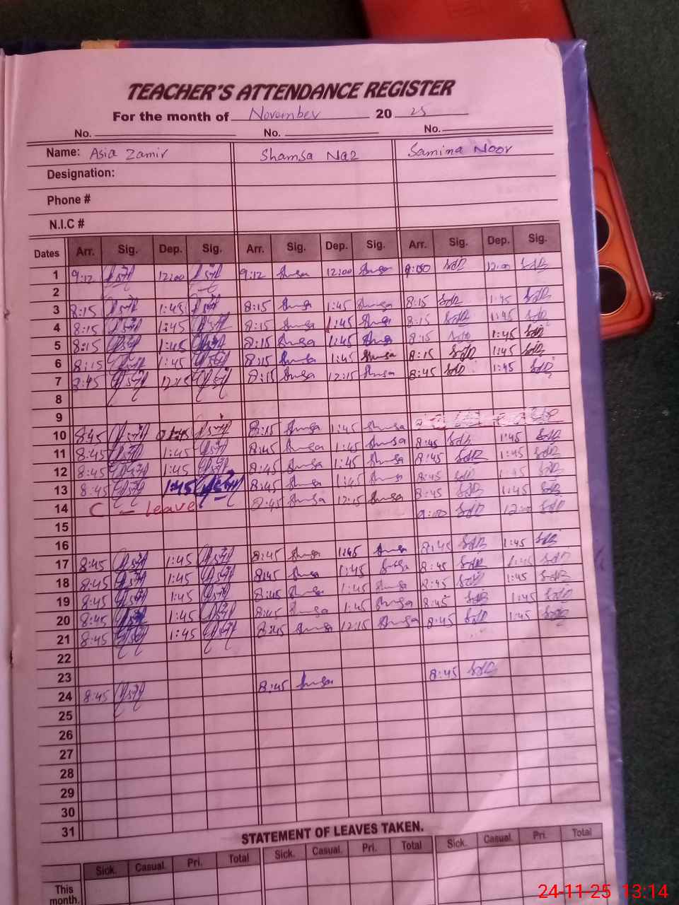 | CNIC | Full Name | Designation | R/C | Absence during last cal. month |