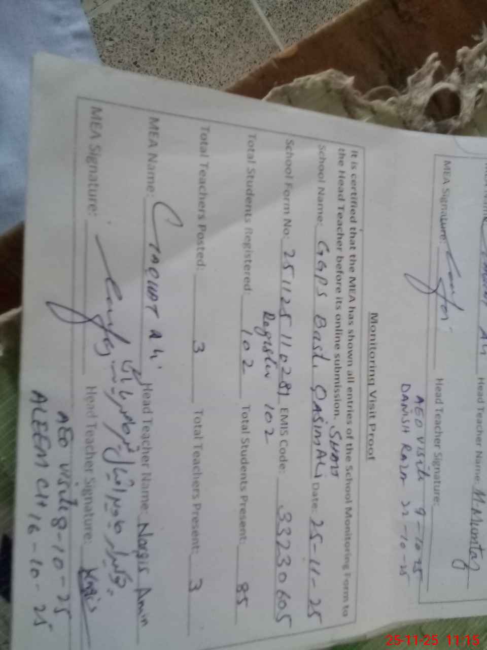 | Attendance Register | Head Teacher | MEA with School | Visit Proof |