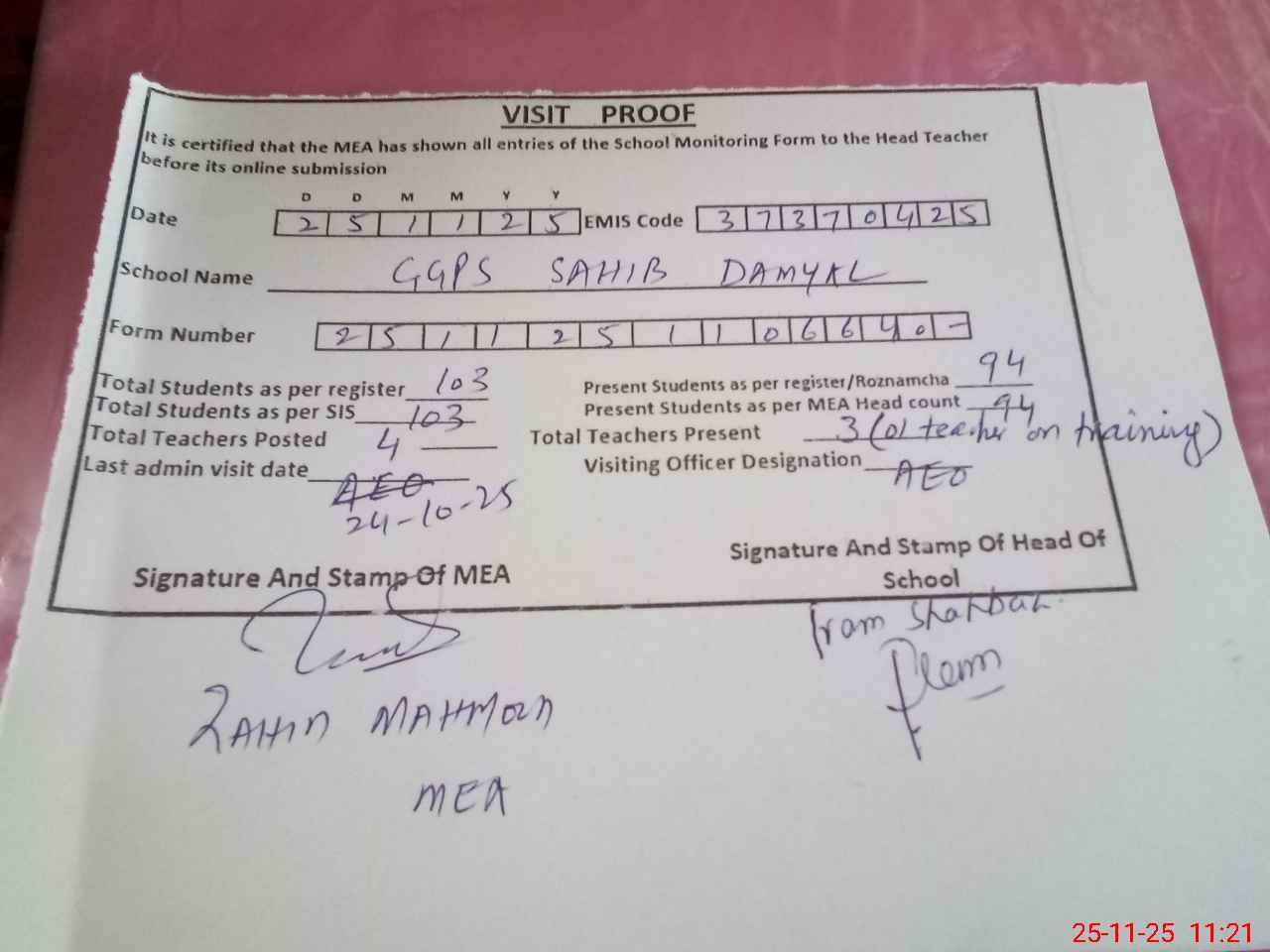 | Attendance Register | Head Teacher | MEA with School | Visit Proof |