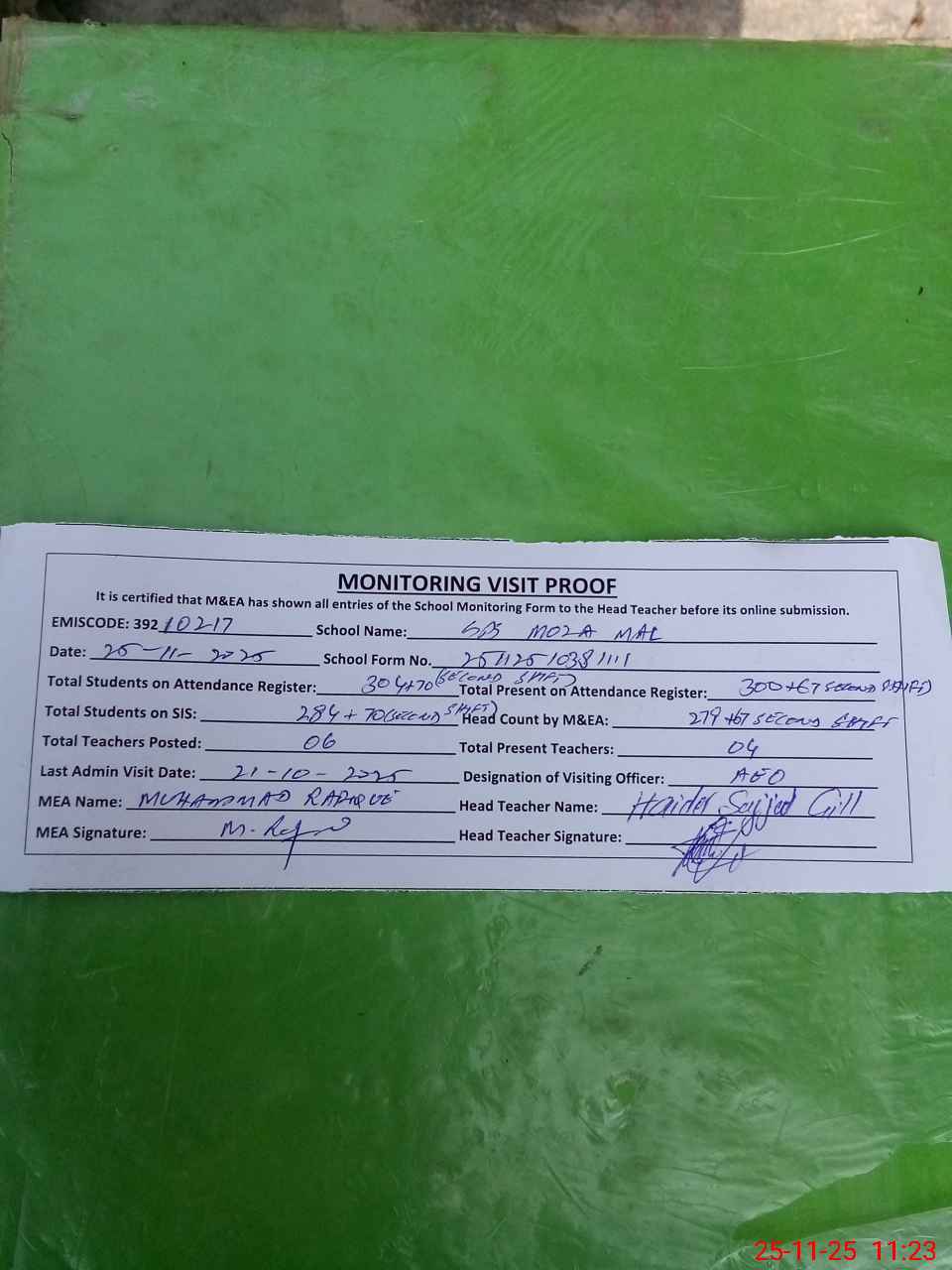 | Attendance Register | Head Teacher | MEA with School | Visit Proof |