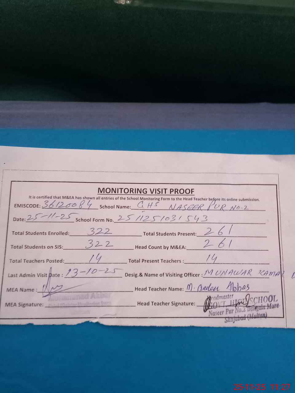 | Attendance Register | Head Teacher | MEA with School | Visit Proof |