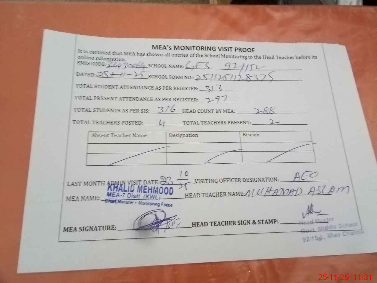 | Attendance Register | Head Teacher | MEA with School | Visit Proof |