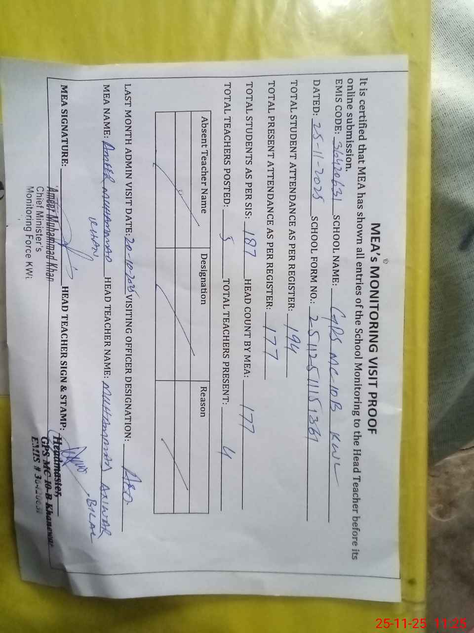 | Attendance Register | Head Teacher | MEA with School | Visit Proof |