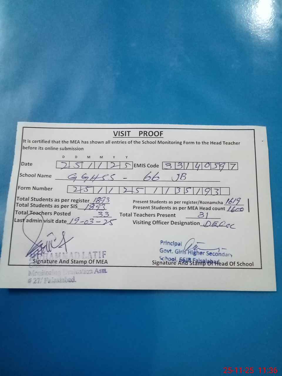| Attendance Register | Head Teacher | MEA with School | Visit Proof |