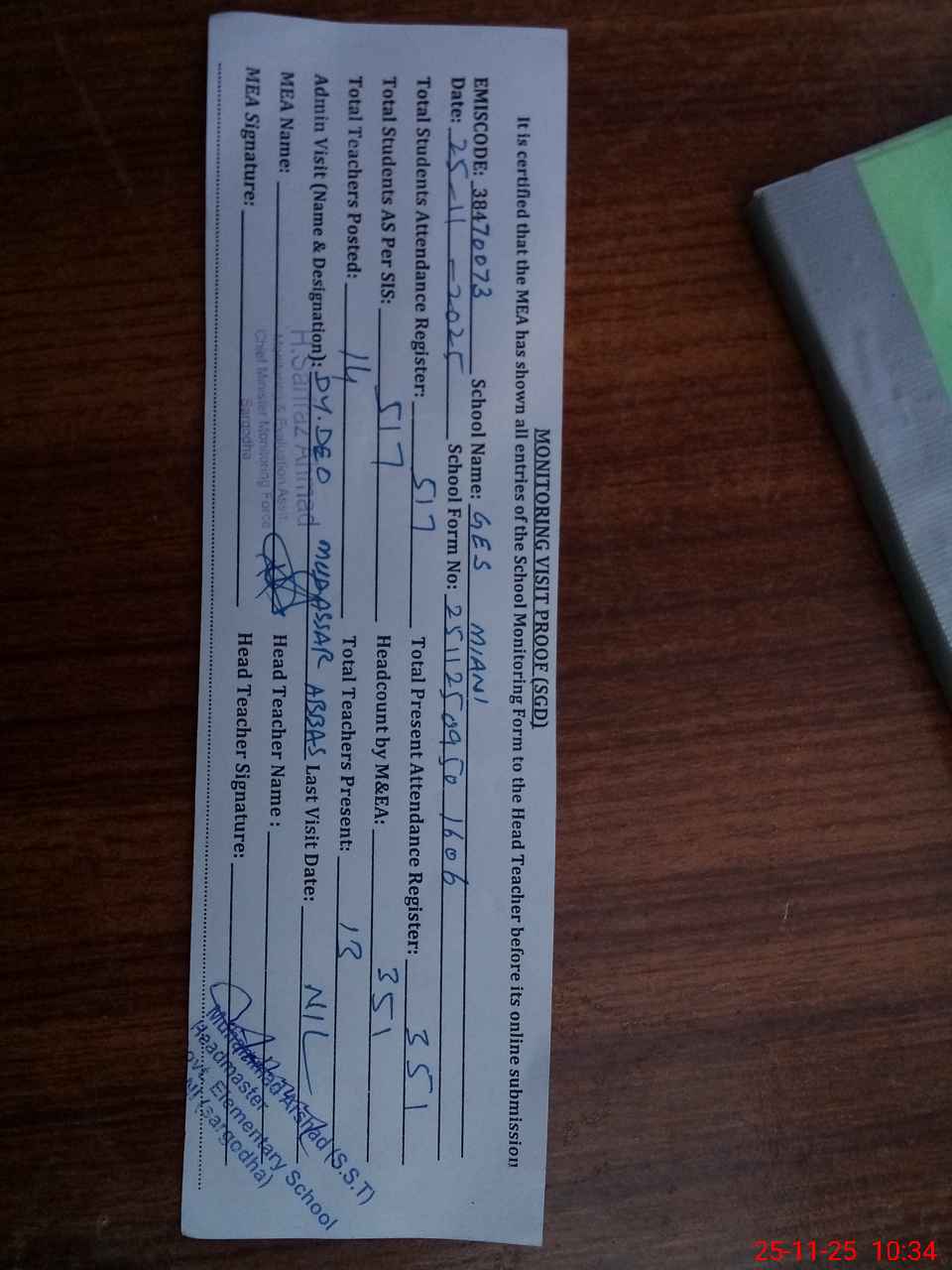| Attendance Register | Head Teacher | MEA with School | Visit Proof |