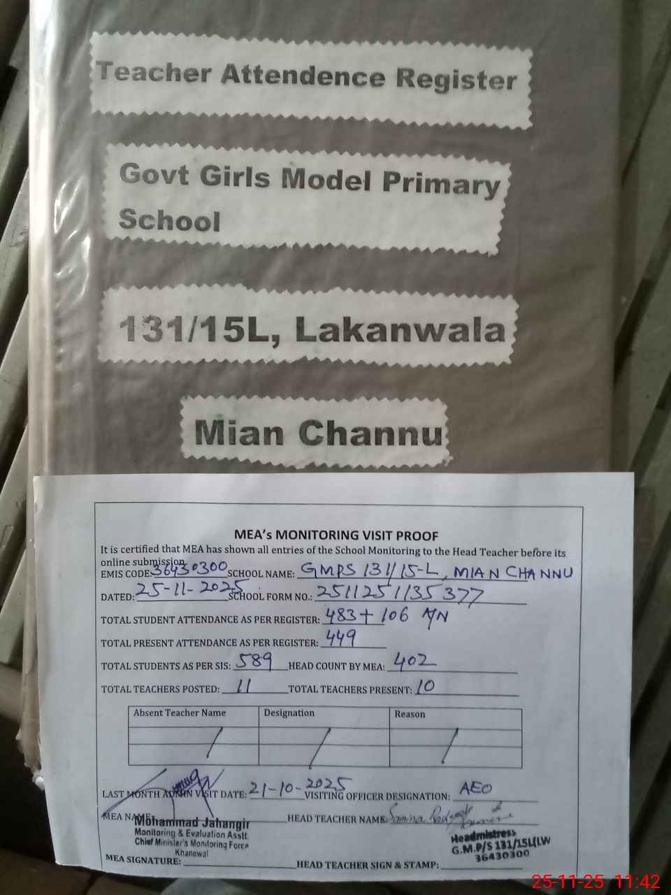 | Attendance Register | Head Teacher | MEA with School | Visit Proof |