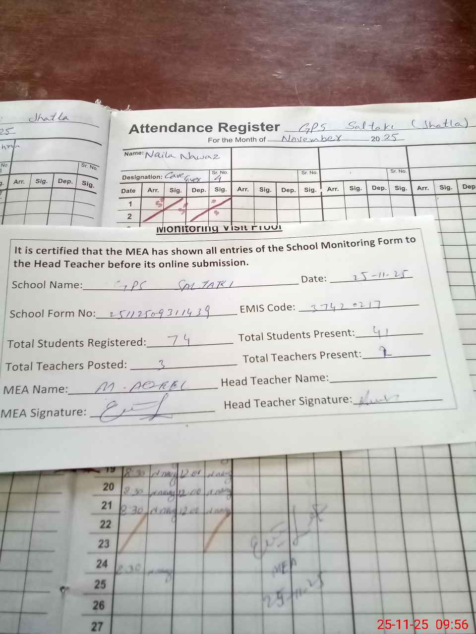 | Attendance Register | Head Teacher | MEA with School | Visit Proof |