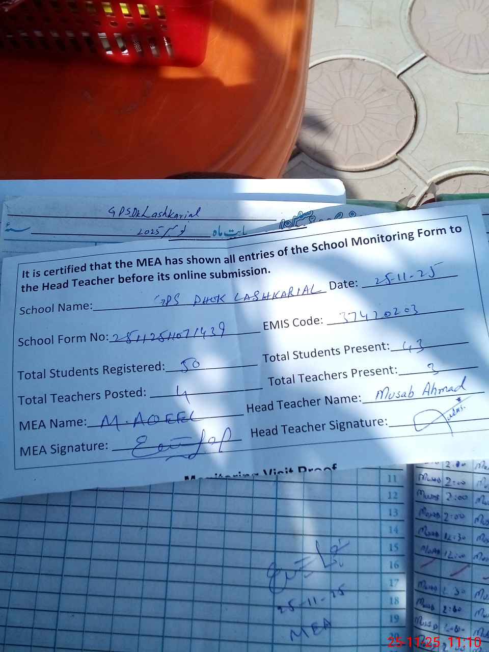 | Attendance Register | Head Teacher | MEA with School | Visit Proof |