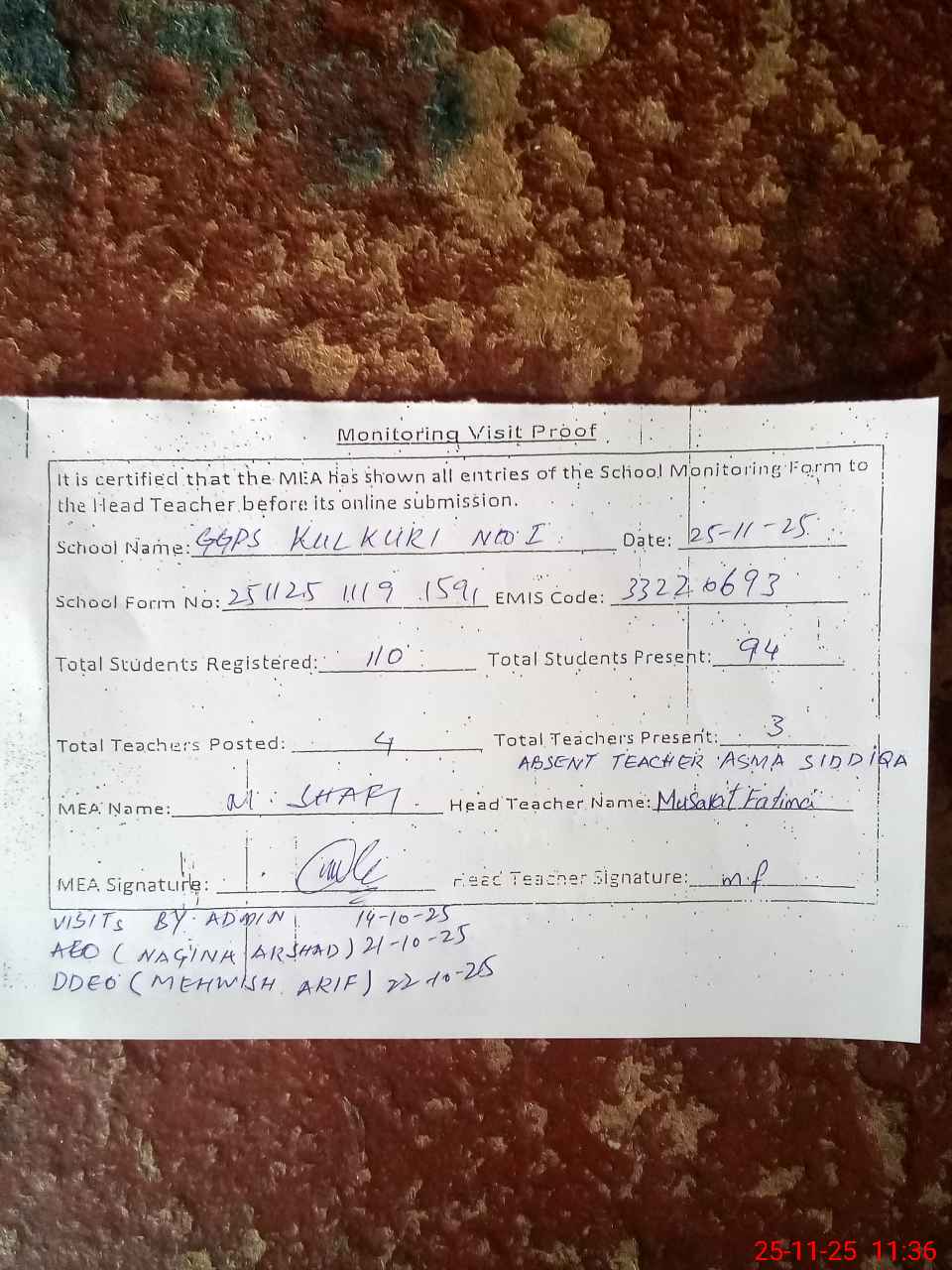 | Attendance Register | Head Teacher | MEA with School | Visit Proof |