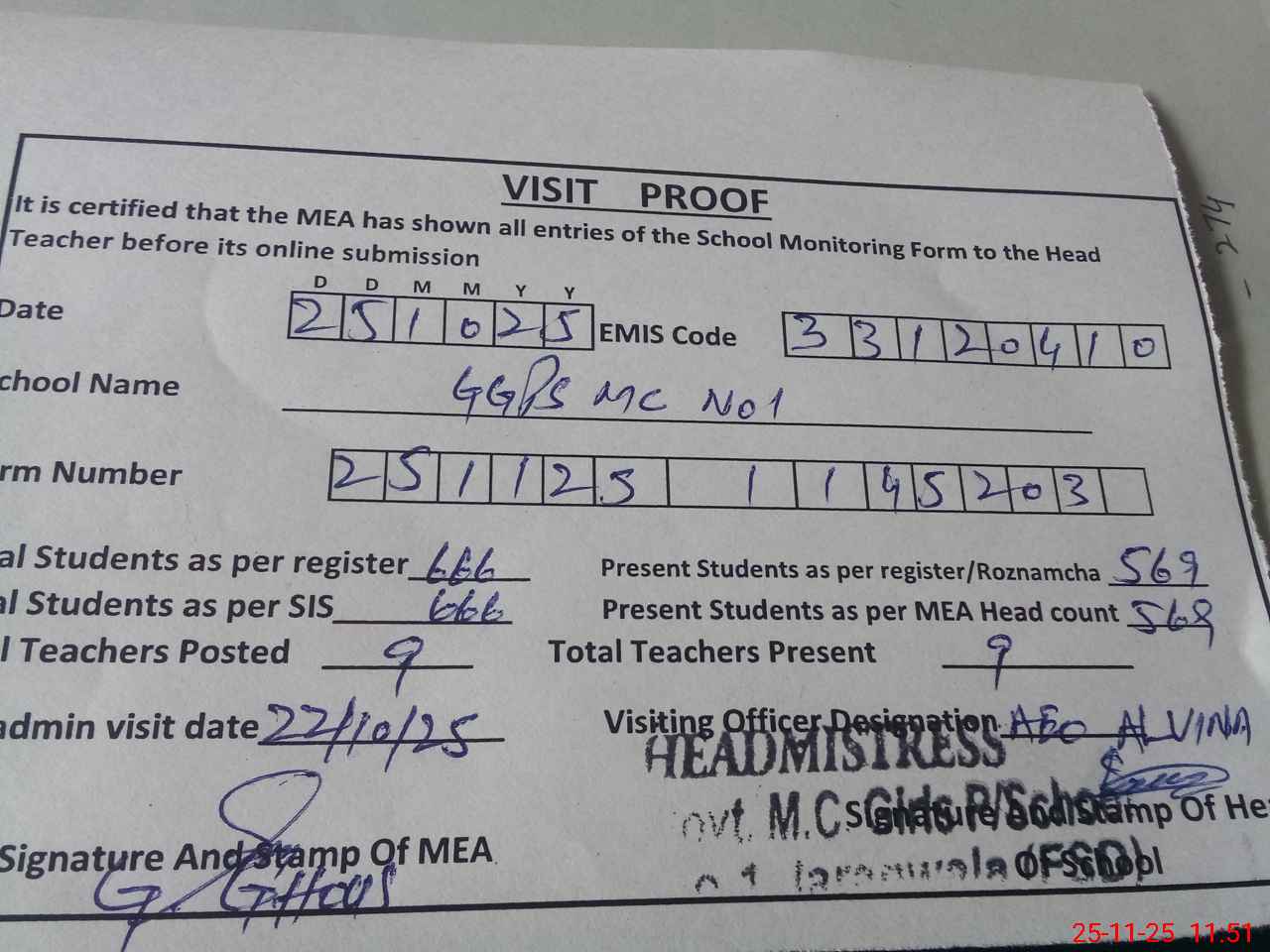 | Attendance Register | Head Teacher | MEA with School | Visit Proof |