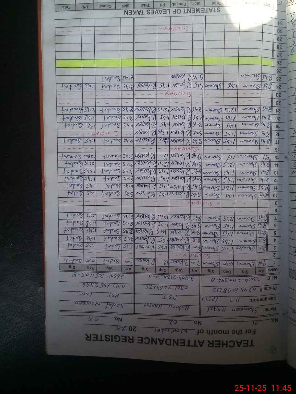 | CNIC | Full Name | Designation | R/C | Absence During Last Calender Month |